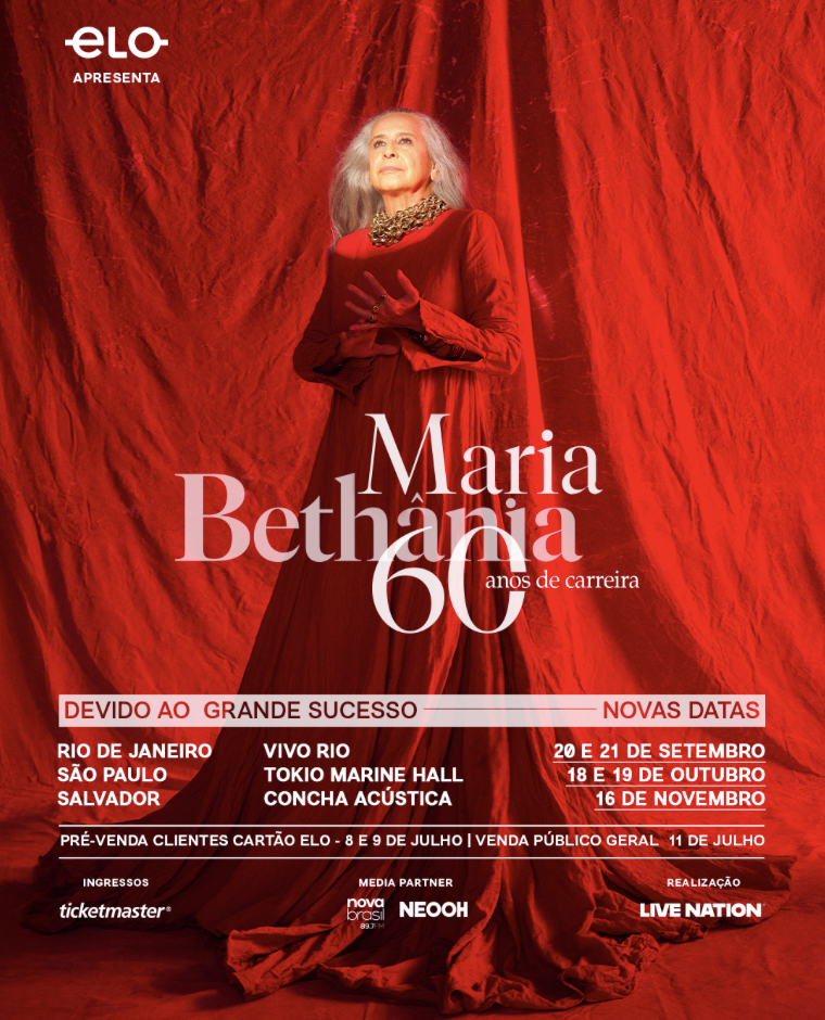 Após esgotar quatro shows no Rio de Janeiro, quatro em São Paulo e um em Salvador, a série de apresentações comemorativas dos 60 anos de carreira de Maria Bethânia acaba de ganhar datas extras. Foram adicionados dois shows no Rio de Janeiro, nos dias 20 e 21 de setembro, no Vivo Rio; dois em São Paulo, nos dias 18 e 19 de outubro, no Tokio Marine Hall; e no dia 16 de novembro, em Salvador, naConcha Acústica.