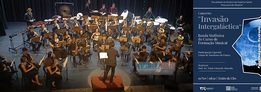 No próximo dia 19 de novembro, às 19h30, no Teatro da Universidade Federal do Espírito Santo (Ufes), em Vitória, a Banda Sinfônica do Curso de Formação Musical (CFM) da Faculdade de Música do Espírito Santo (Fames) apresenta o concerto “Invasão Intergaláctica”.